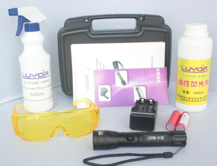 500ml luyor-6100油性濃縮熒光檢漏劑,500ml染料清洗劑,LUYOR-3130紫外熒光檢漏燈,充電器,充電電池,LUV-30熒光增強防護眼鏡,熒光劑添加標簽,手提箱
