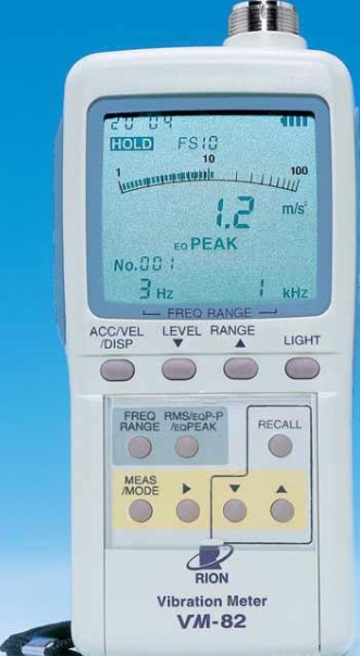 日本理音(RION)公司生產的VM-82便攜式數字測振儀重320克,是VM-63測振表的改進型,使用分離式振動傳感器,可對微小振動及超強振動進行測量, VM-82便攜式數字測振儀可測機械設備的振動位移、速度(烈度)和加速度。 VM-82便攜式數字測振儀可以儲存1000組測點的數據,并能與微機進行通訊。已開發的軟件具有如下功能: (1).信息管理(包括機器、測點及測試數據的管理、建立檔案) (2). 儀器與微機通訊 (3).趨勢分析 (4).打印報表(機器報表、測點報表) (5).狀態判斷(自動判定狀態:良好、注意、危險)