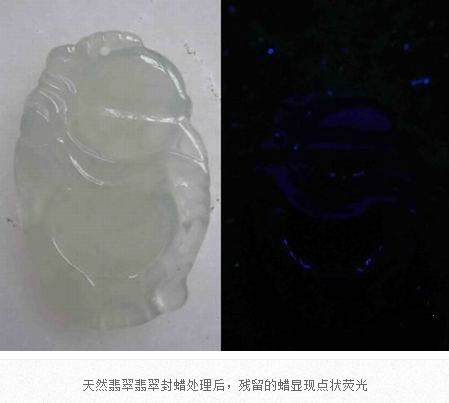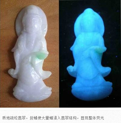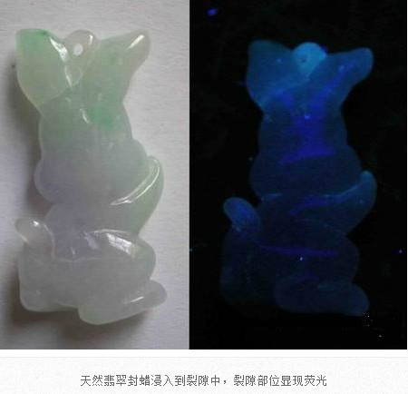 翡翠成品在雕刻成為毛坯后,在拋光前,都會進行封蠟處理,封蠟后可使蠟在拋光后進入翡翠表面存在的微細凹坑或裂隙中,填補其不平,使翡翠顯得更加圓潤,增加其光亮程度亮,還可防止油漬的進入。當然,封蠟的最主要的目的就是為了掩蓋裂紋。由于有蠟存在于翡翠中,在紫外熒光燈下會產生明顯紫外熒光。